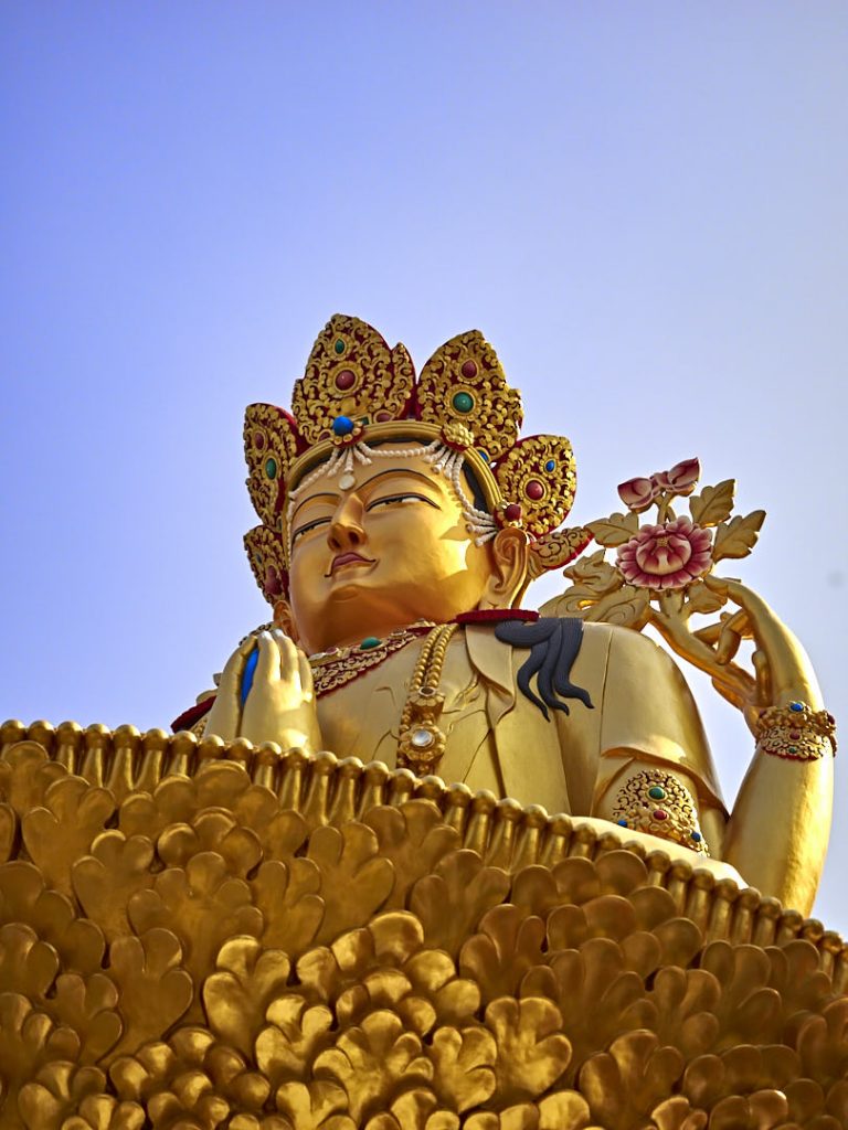 Der schönste Weg zum Gelände zu kommen ist über eine große 365-stufige Treppe. Links und rechts säumen Buddhastatuen den Weg, bunte Gebetsfahnen flattern im Wind. Oben gibt es einen Platz mit zahlreichen Schreinen, die wie kleine Tempel aussehen. Um den Stupa herum befinden sich wieder zahlreiche Gebetsmühlen (genau 211 Stück). Eigentlich braucht man gar nicht viel schreiben. Lasst einfach die Bilder auf euch wirken!