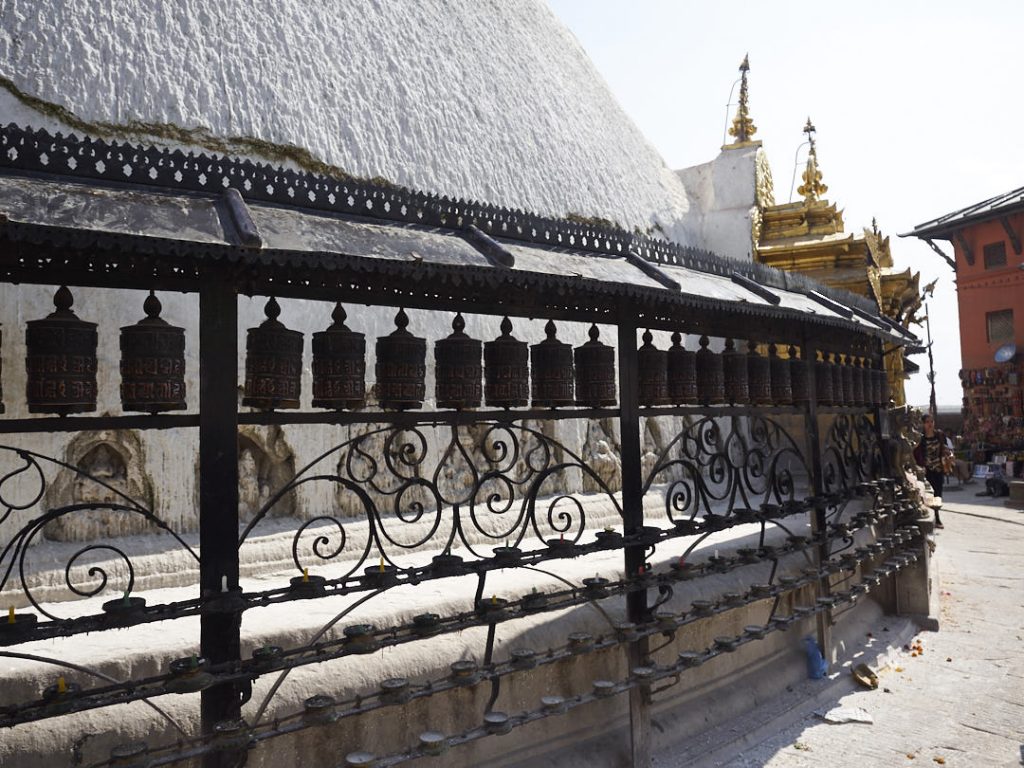 Um den Stupa herum gibt es zahlreiche Cafés, Restaurants und Geschäfte. Vor allem auch aufgrund der Bedeutung für den tibetanischen Buddhismus sind die meisten Besucher Gläubige. Sie gehen mit gleichmäßigen Schritten im Uhrzeigersinn um das Wahrzeichen herum, summen ein Mantra, oder drehen die Gebetsmühlen. Man sieht neben den typischen roten Mönchgewändern, Menschen in traditionell tibetanischer Kleidung oder Jeans und Nikes. Dazu kommen Touristen aus allerlei Ländern. Eine spannende Mischung!