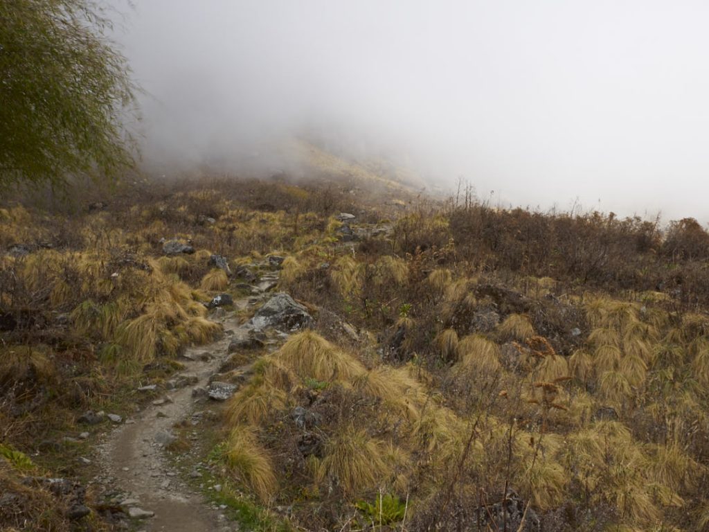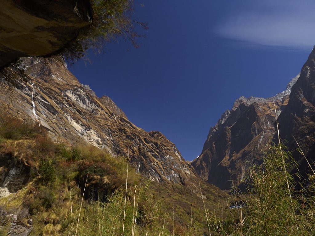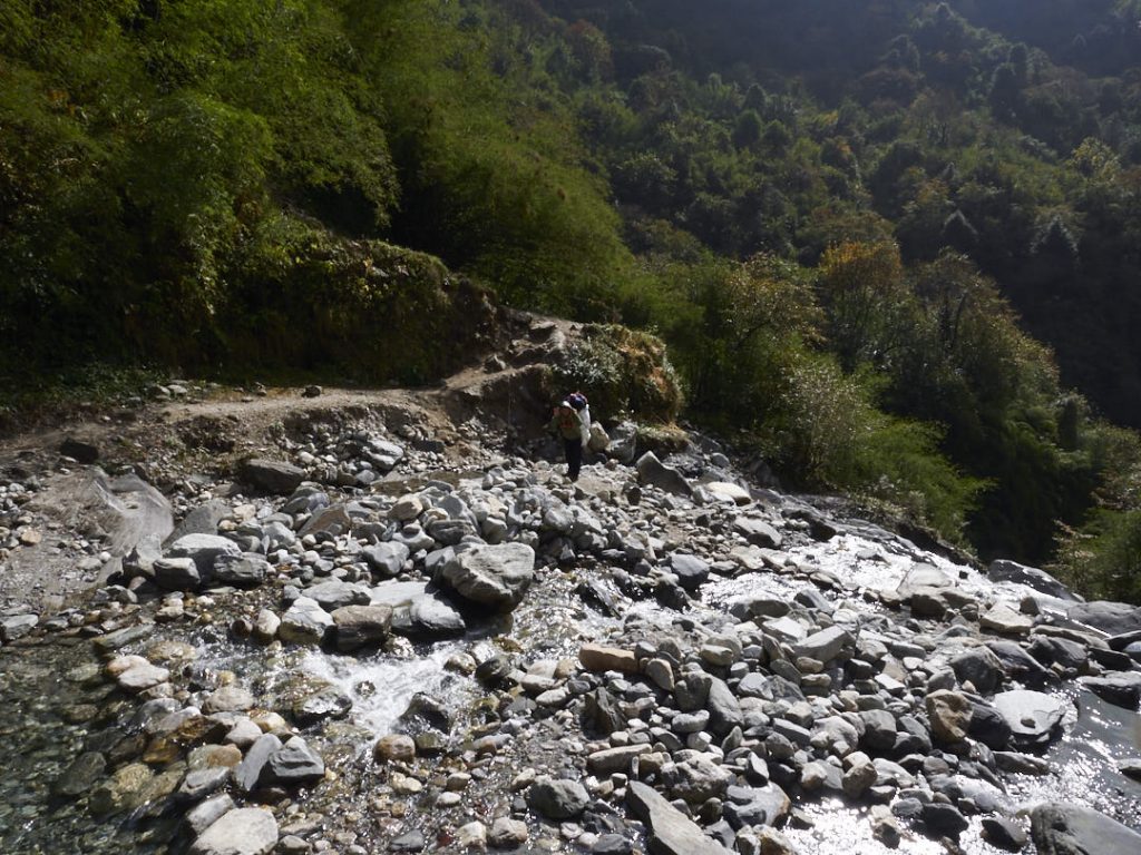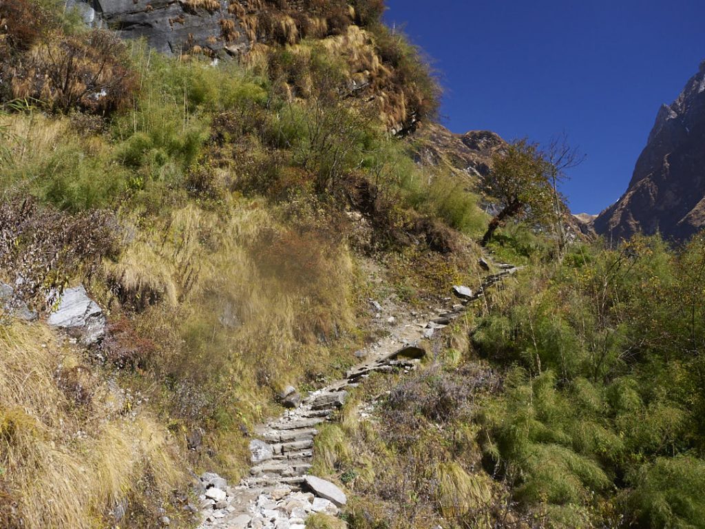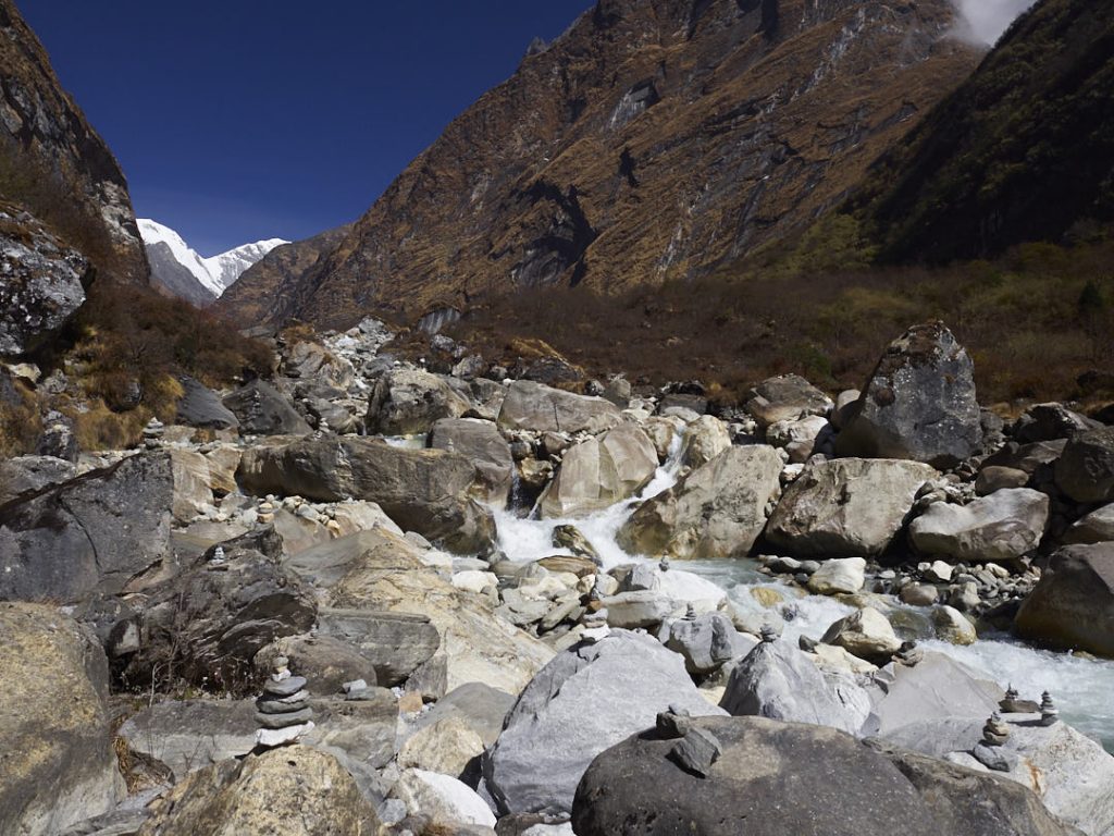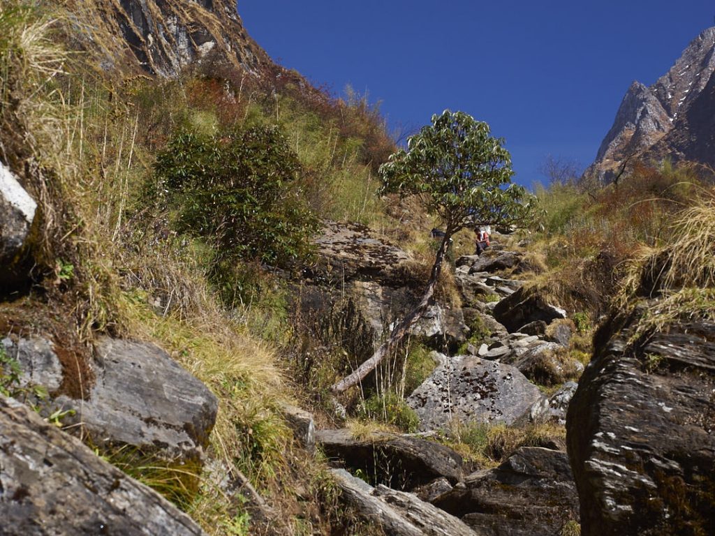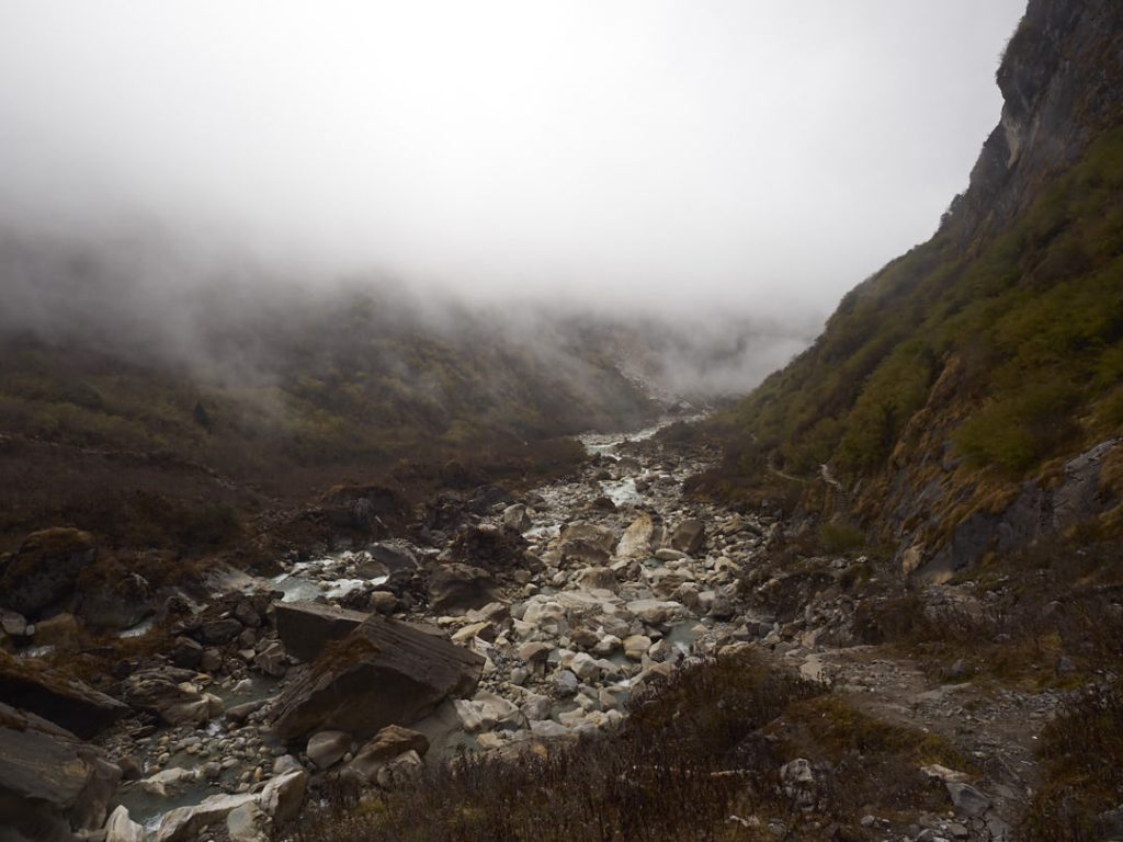 Der Aufstieg zum Machapuchhare Base Camp (MBC) bringt einen krassen Landschaftswechsel mit sich. Die Gegend wird immer schroffer und steiniger mit Gras- und Moosbewuchs. Wir gehen eine ganze Zeit an einem Fluss entlang.