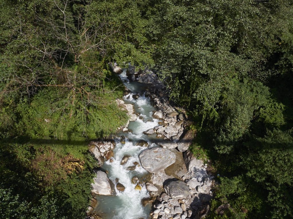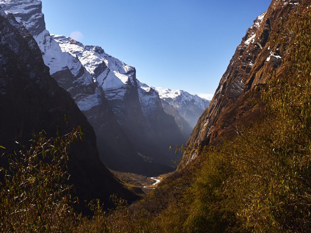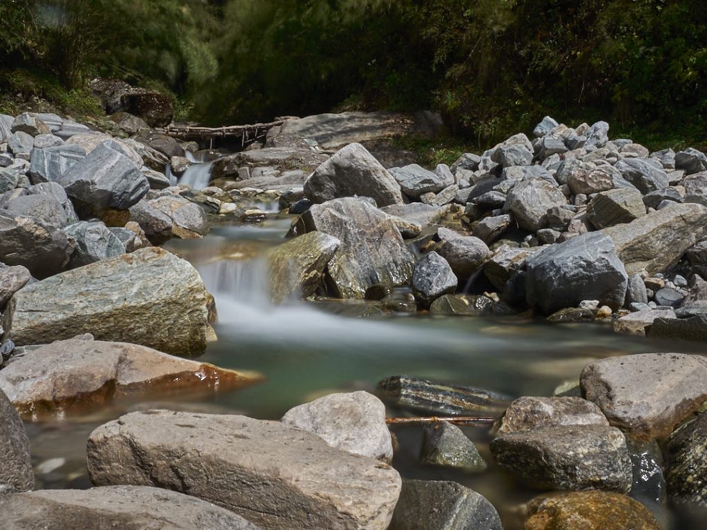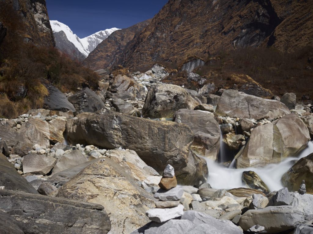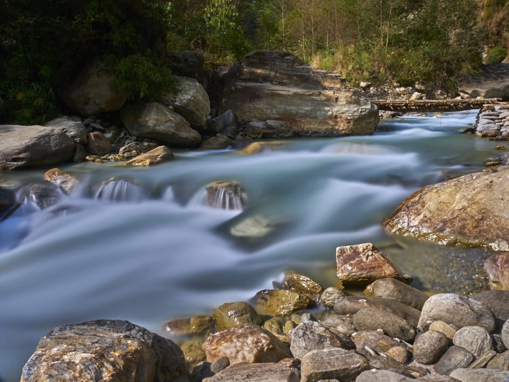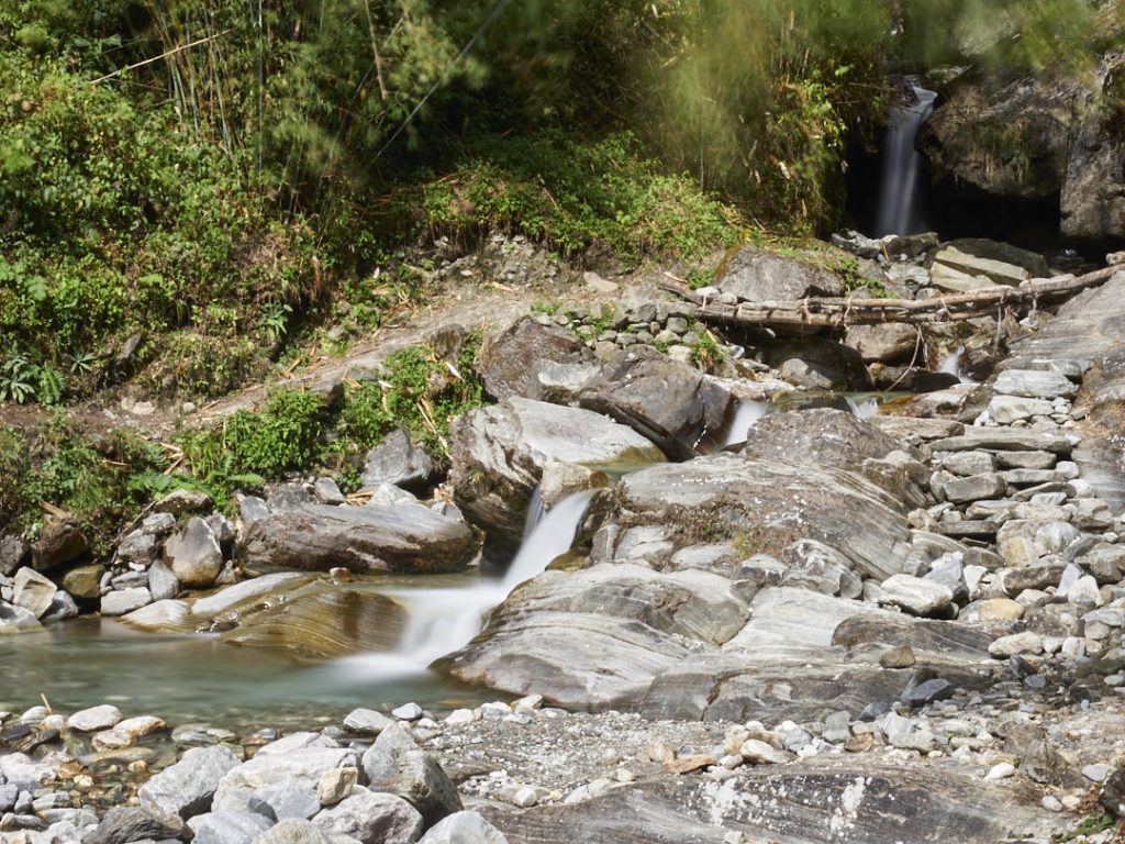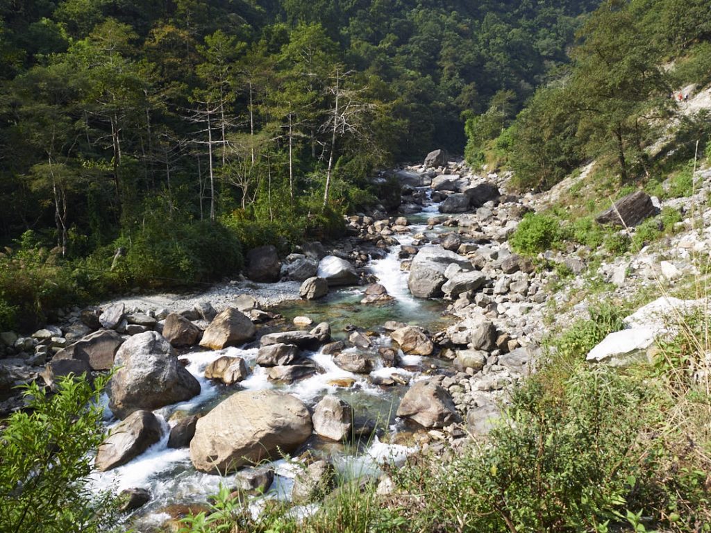 Der Aufstieg zum Machapuchhare Base Camp (MBC) bringt einen krassen Landschaftswechsel mit sich. Die Gegend wird immer schroffer und steiniger mit Gras- und Moosbewuchs. Wir gehen eine ganze Zeit an einem Fluss entlang.