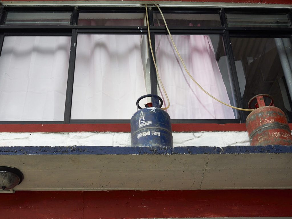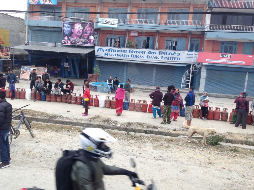 Nach ein paar Minuten fuhren wir an einer meterlangen Menschenschlange vorbei. Ein Ergebnis der Energiekrise. Die Grenze zu Indien war blockiert, weshalb es ganz große Probleme gab, Gas und Benzin zu beschaffen. Ende vom Lied: jeder, der seine Gasflaschen auffüllen lassen wollte wartete Stunden, wenn nicht tagelang. Ausnahme waren Touristenbusse – was uns echt peinlich beschämte. Einmal mehr, dass uns auf unseren Reisen bewusst wurde, in welchem Schlaraffenland wir tatsächlich leben.
