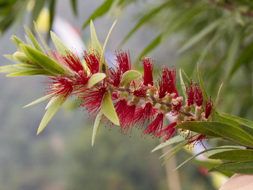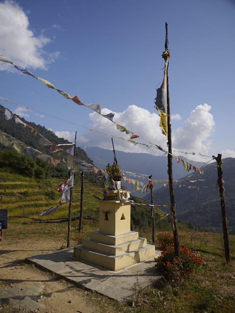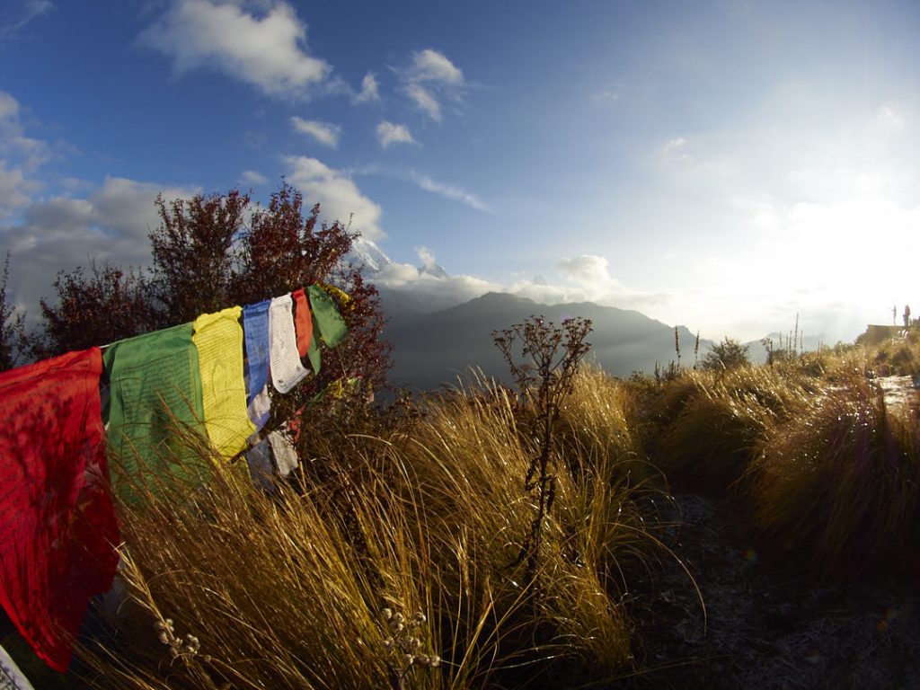 Ghorepani, das kleine Dörfchen, wo wir hingehen liegt auf 2.874m. Das bedeute: rund 1.300 Höhenmeter auf 8,7 Kilometer verteilt. Wir müssen unzählige Verschnaufspausen machen – mental hangeln wir uns von Pause zu Pause. Na das kann ja was geben… Was uns allerdings – neben den Pausen – auch noch durch den Tag rettet sind die schnuffeligen Muliherden und die unfassbar tolle Landschaft mit den zahlreichen im Wind wehenden Gebetsfahnen.