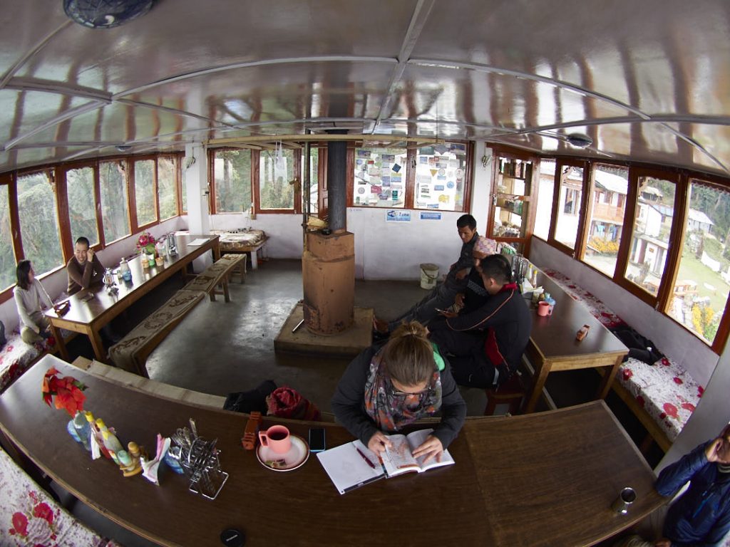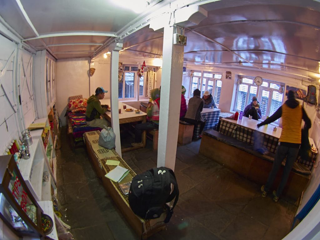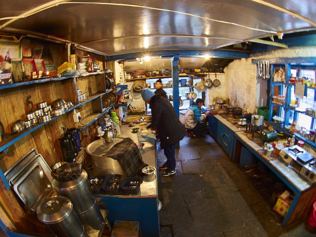 Im Himalaya angekommen pellen wir uns erstmal aus den nassgeschwitzten Klamotten. Es gibt leckeres Dal Bhat und ich bekomme sogar noch eine extra-Portion.