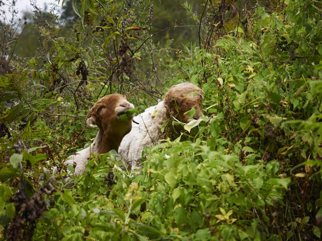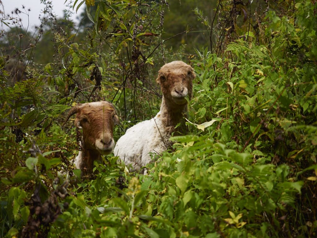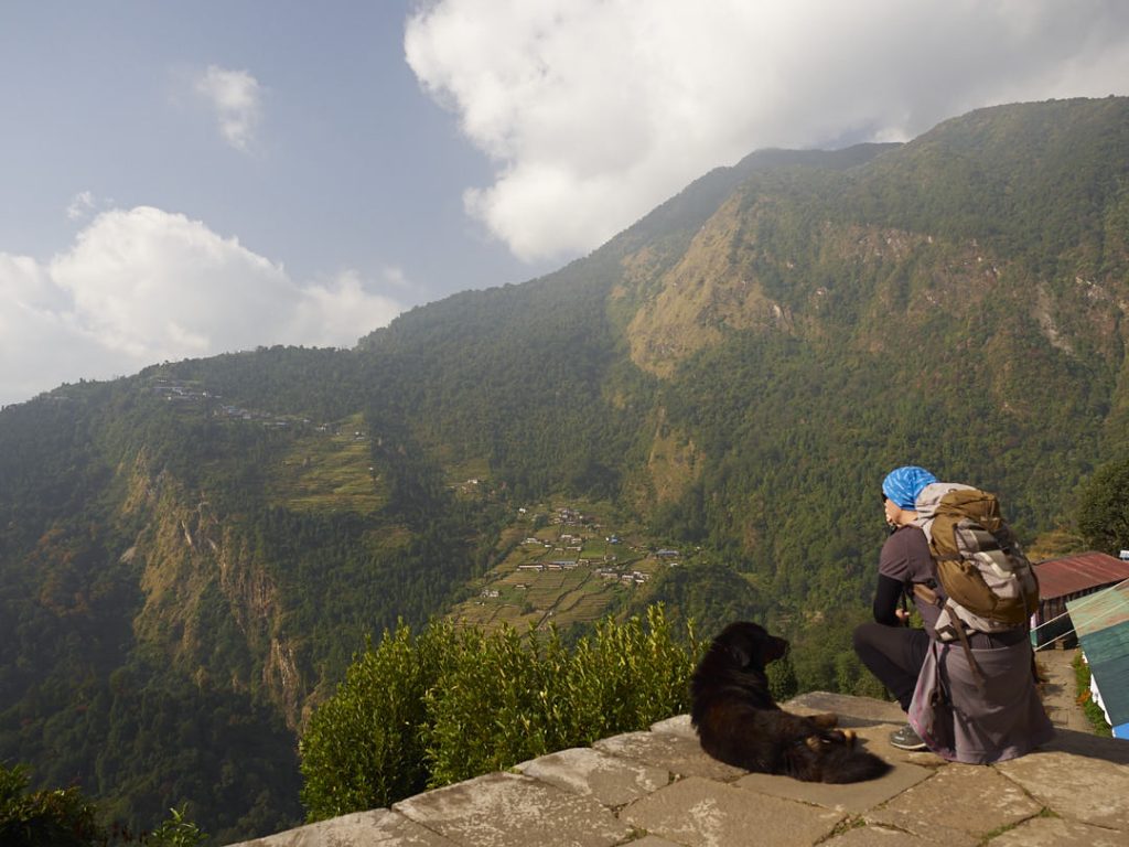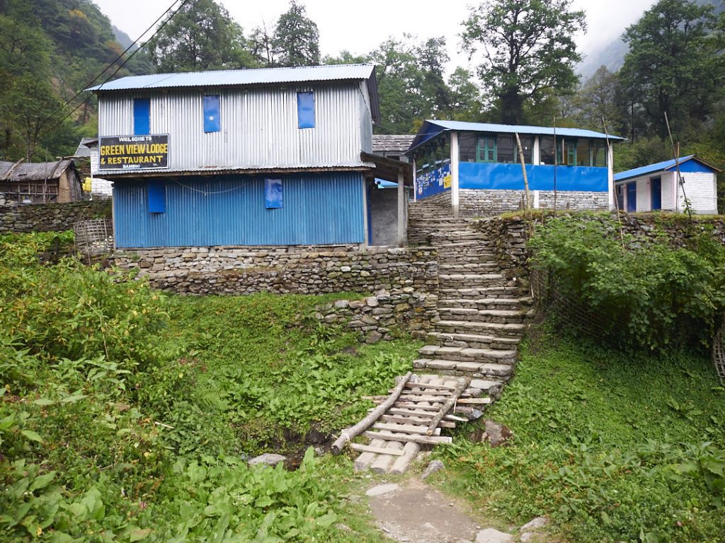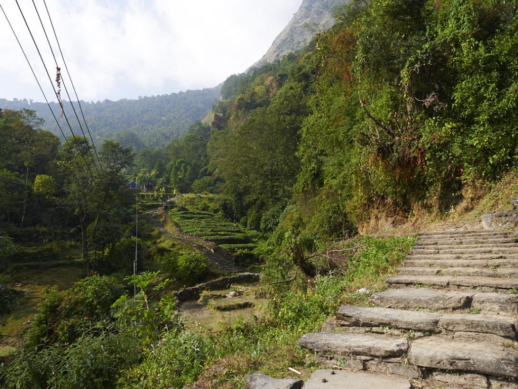 Morgens hatte Olaf eine Begegnung mit eine (O-Ton) Rieeeeesenfledermaus. Sie hatte sich wohl als Schlafplatz die Dusche ausgesucht. Auf jeden Fall war er nach dem Schreck gut wach und wir konnten schnell weiterziehen. Heute geht es nach Chomrong. Der Ort liegt etwas tiefer auf knapp über 2.130m. Man freut sich und stellt sich auf einen entspannten Walk ein. Weit gefehlt. Auf eine geringere Höhe zu gehen bedeutet nicht, dass es zwischendurch nicht auf und ab geht. Die Strecke ist wieder wunderschön: dicht bewachsener Wald, Hängebrücken, kleine Bäche, Steine und Stufen. Unterwegs treffen wir auf einige andere Trekker, Porter oder Locals und natürlich Büffelherden, Mulis und Ziegen.