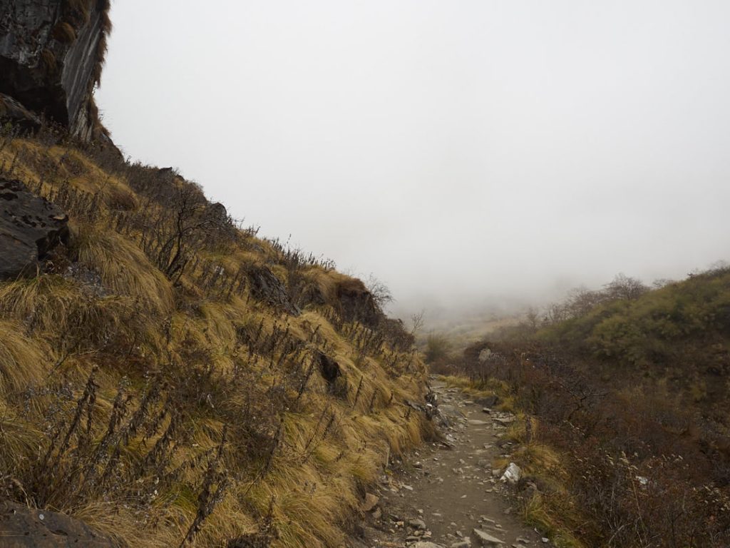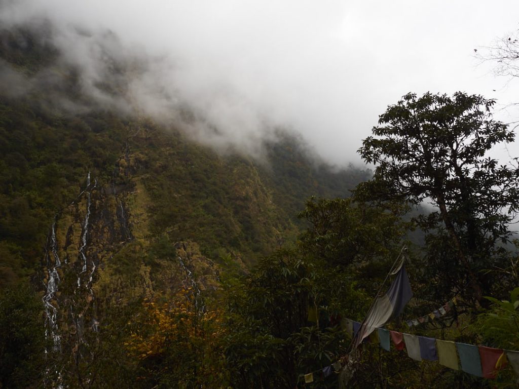 Links und rechts säumen den Weg kleine Wasserfälle – und – wir kommen der Schneegrenze immer näher. Je weiter wir richtung MBC gehem, desto spookyer wird es: eine dichte Nebelwand rollt auf uns zu und es wird schlagartig kälter. Irgendwann hüllt uns der Nebel so krass ein, dass wir kaum die eigene Hand erkennen. Man kann sich so ganz gut vorstellen, wie schnell hier in den Himal das Wetter umschlägt und auch echt gefährlich werden kann.