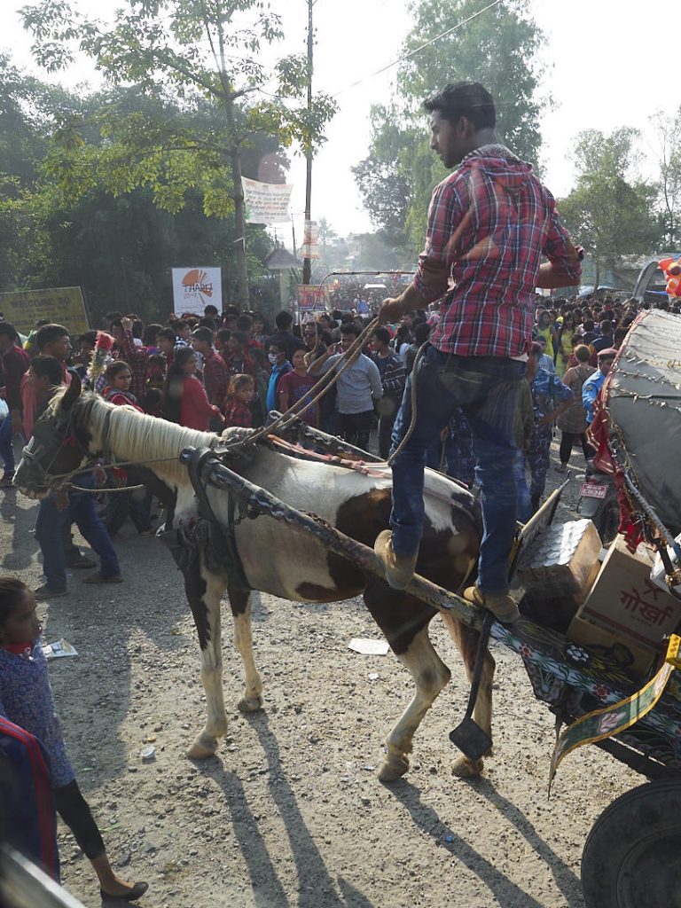 Nachdem wir einen Tag in Pokhara entspannt und uns eine Ayurvedische Massage gegönnt haben, geht es mit dem Bus zum Chitwan Nationalpark. Die Fahrt dauert ab 6 Stunden, je nachdem, wie die Straßenbeschaffenheit zur Reisezeit ist oder sonst irgendwas dazwischen kommt. Bei uns kam eine Feierlichkeit dazwischen. Diejenigen, die schonmal in Nepal oder anderen südasiatischen Ländern zu Besuch waren kennen das: alle, also wirklich ALLE, sind auf der Straße unterwegs, egal ob zu Fuß, mit Fahrrad, Mofa, Kutsche, Auto oder Bus. Es gibt tonnenweise Stände an den Straßenrändern, die bunten Krimskrams, Zuckerwatte oder sonstige Lebensmittel verkaufen. Auf jedem Fleckchen Wiese sitzen Menschen und picknicken. Ein totales Chaos und wir mit unserem Mega-Reisebus mittendrin. Es hat Ewigkeiten gedauert, bis wir da durch waren, aber gut, was will man machen.