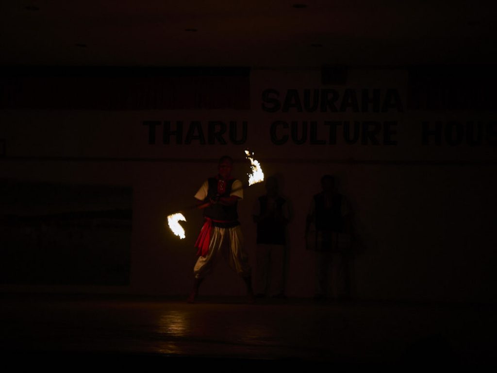 Abends schlendern wir nur ein wenig durch das Dorf (Sauhara). Es gibt einige Souvenirshops, die Papier aus Elefantendung oder Honig aus der Region verkaufen. Abends schauen wir uns noch eine Vorführung im Tharu Culture House an. Die Tharu lebten in den Urwäldern zwischen Nepal und Indien und entwickelten eine ganz eigene Kultur. Diese wird bei den Vorführungen getanzt und besungen. Hier ist über die Tharu vor allem bekannt, dass sie eine starke Resistenz gegenüber Malaria haben, was wohl auf ihre Genetik zurückzuführen ist.